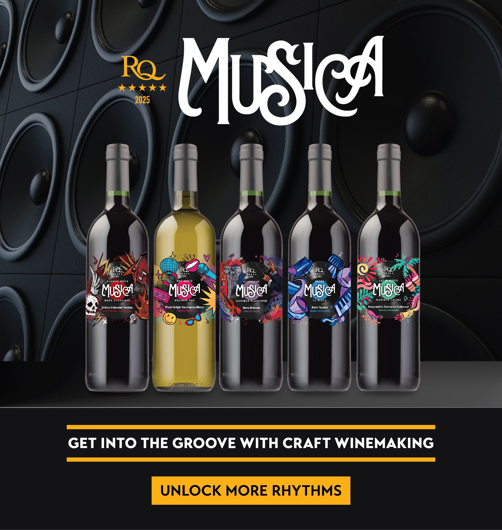 Groove to RQ25’s Musica, a melodic soundtrack composed of five best-selling Australian, Italian and Spanish wines, all ready to hit the stage for a spectacular encore. Savour this symphonic collection, where tasting notes, musical harmonies and vinyl rhythms unite to create rich and unforgettable melodies for your palate.